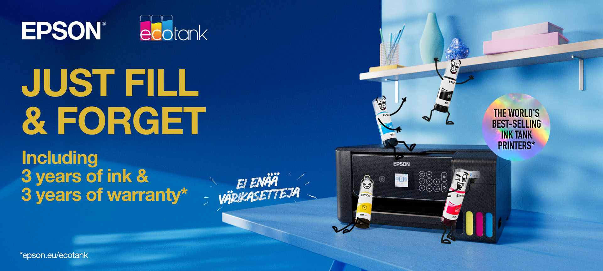 Voit pidentää EcoTank-tulostimesi takuuajan kolmeen vuoteen rekisteröimällä tulostimen 30 päivän sisällä ostosta osoitteessa www.epson.fi/extended-warranty
