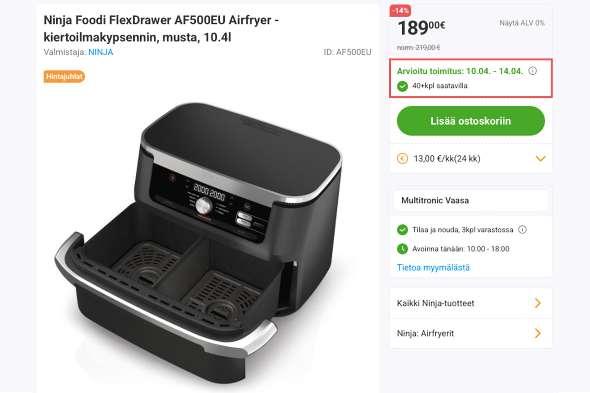 Jos tuote on merkitty "varastossa", se sijaitsee keskusvarastossamme ja on valmis lähetykseen heti, kun tilaus on käsitelty. Varastossa olevat tuotteet lähetetään yleensä 1-2 arkipäivän kuluessa tilauksen käsittelystä.
